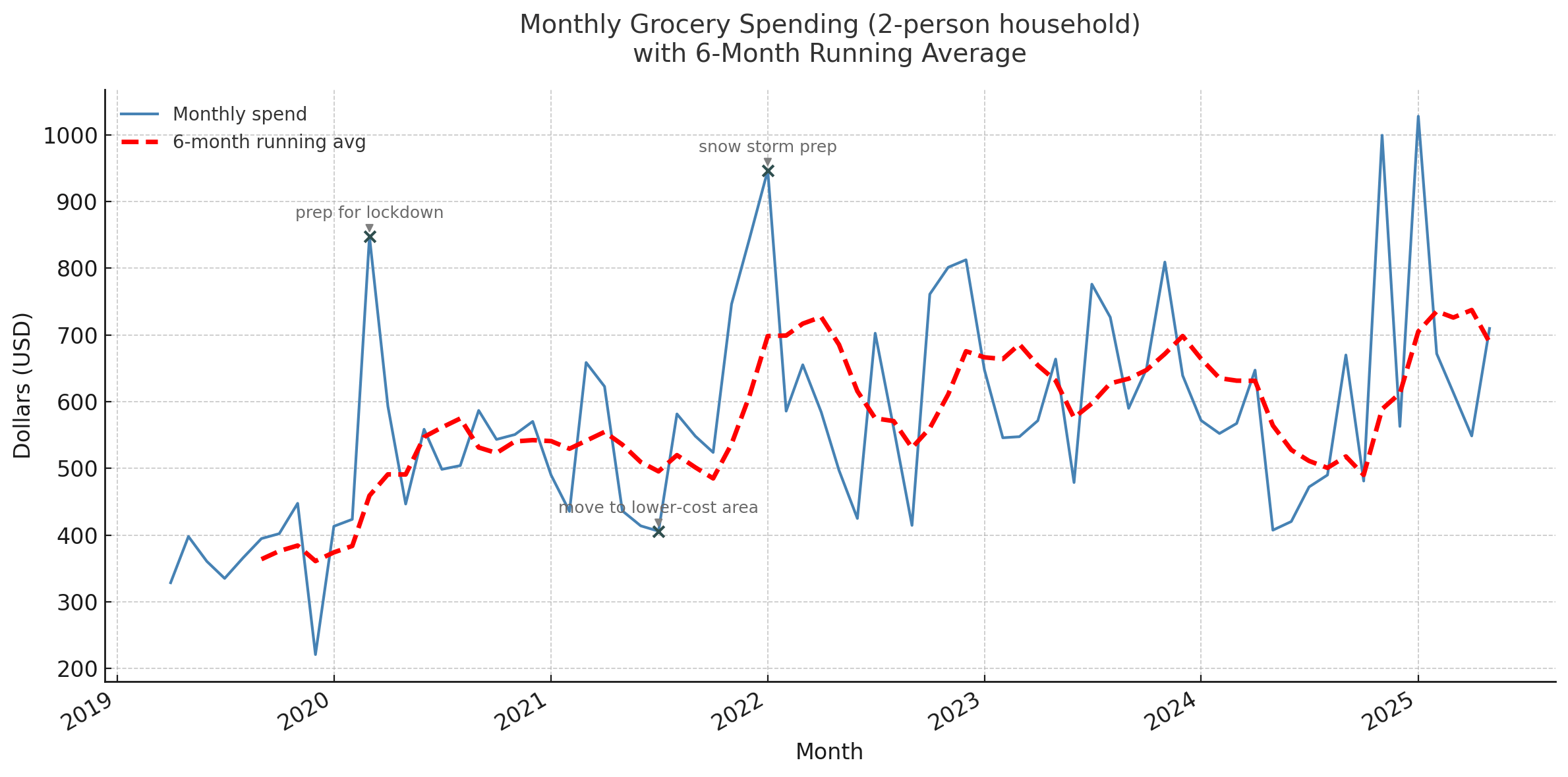 I tried to annotate a few instances where specific events would have an impact on the data; I have no explanation for the recent spikes. I wish I had data from 2018 to show more of those lower prices before the pandemic. The location we moved to in the middle of 2021 supposedly has 5-10% lower food cost. We eat out maybe once per week so most food consumption is grocery.