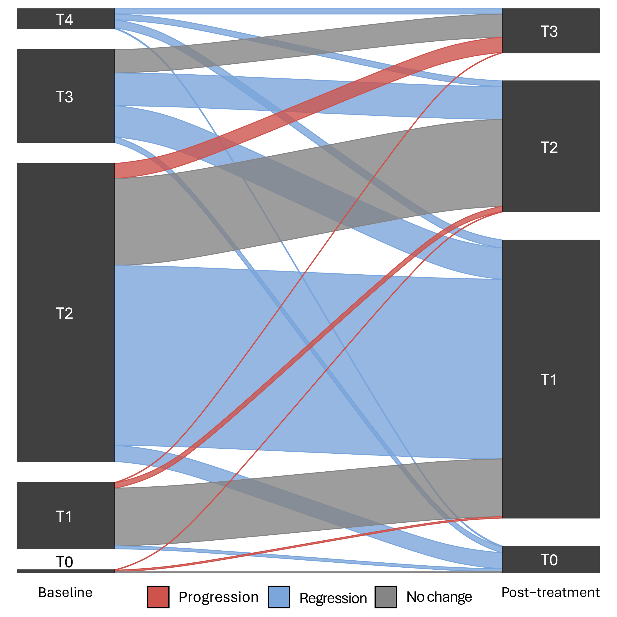 3. What do the stages T0 through T4 mean? How positive of a development is it if cancer regresses from T2 to T1? Does that negate the need for surgery? What drives the need for surgery?