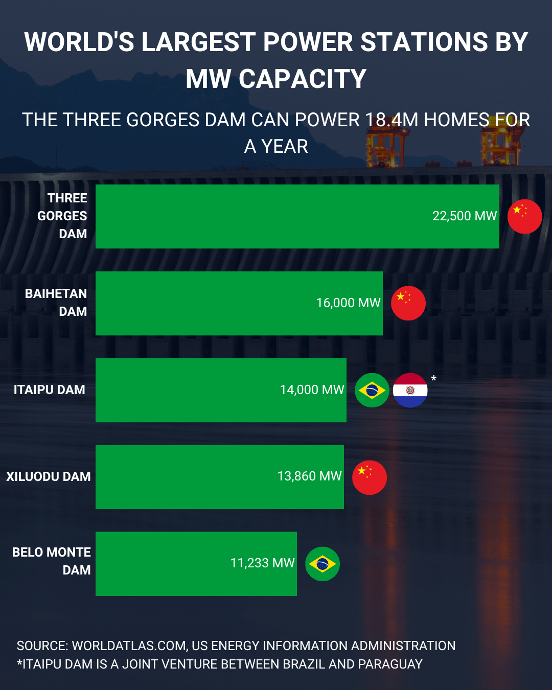 9 out 10 of the largest power stations in the world are hydroelectric dams.