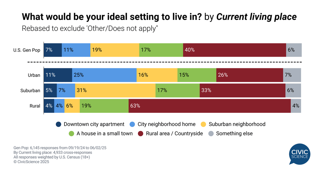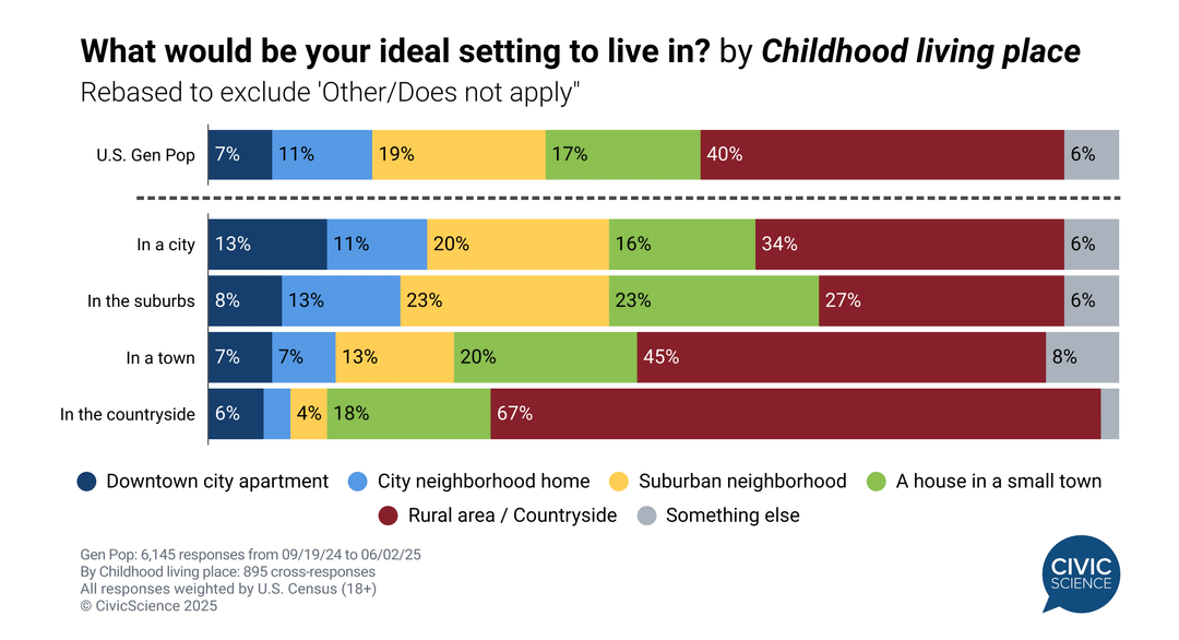 Forty percent (40%) of U.S. adults say the countryside is their ideal place to live, handily beating out cities (~18%), suburbs (19%), and small towns (17%). Respondents' preferences correlate strongly with both current living place and childhood living place.