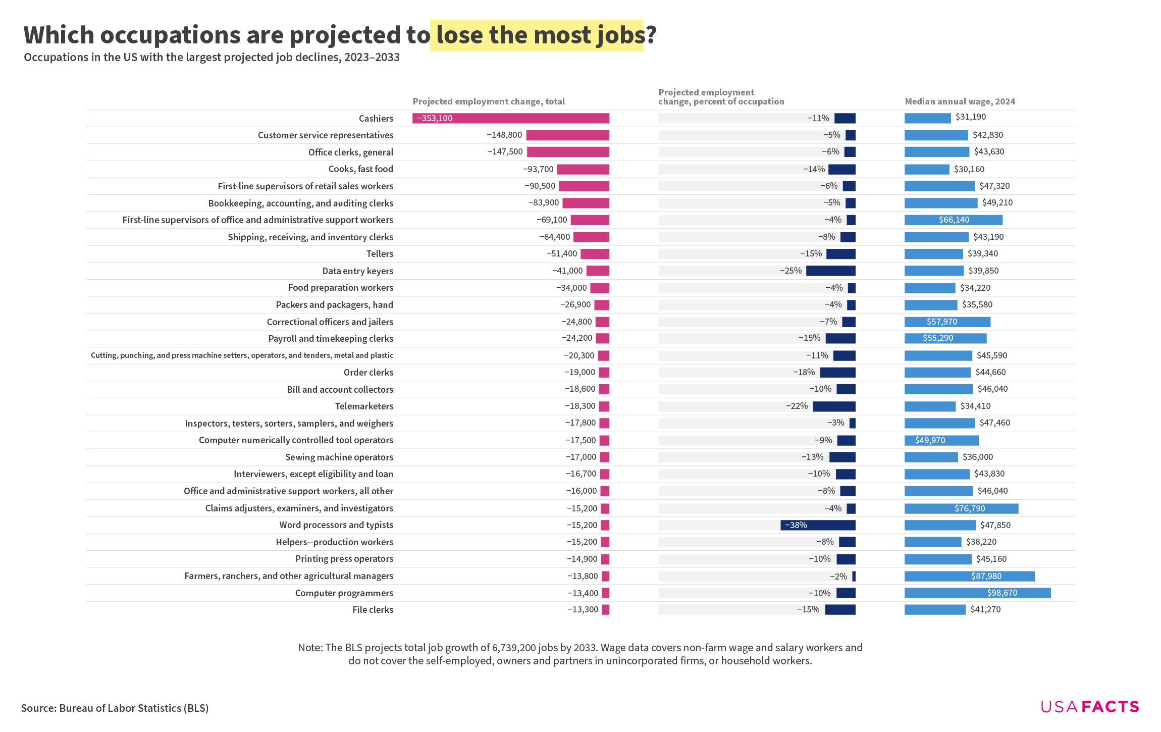 The Bureau of Labor Statistics (BLS) projects total employment to climb by about 6.7 million jobs between 2023 and 2033. Home health aides, software developers, and restaurant cooks are set to gain the most total jobs. We have [a report](https://usafacts.org/articles/what-are-the-fastest-growing-professions-in-america/) that digs into that data, but I found myself interested in the other side of things.