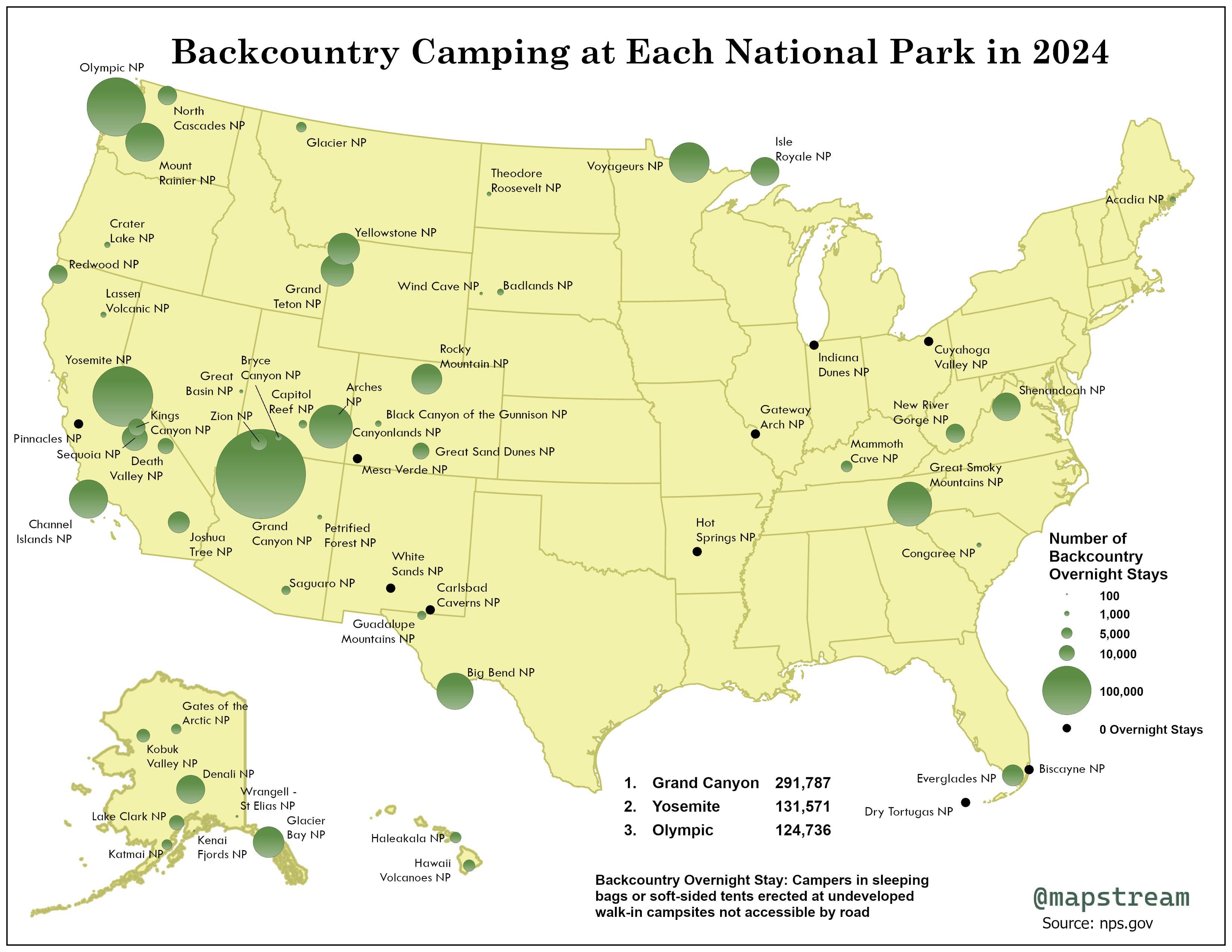 SEKI seems low considering how common it is to cross over from the east side wildernesses. I wonder if they are including an estimate for those since there is no national park permit issued — or even any way for them to definitively know that someone camped inside the park boundaries in those cases. (The same is true for Yosemite but not as common.)