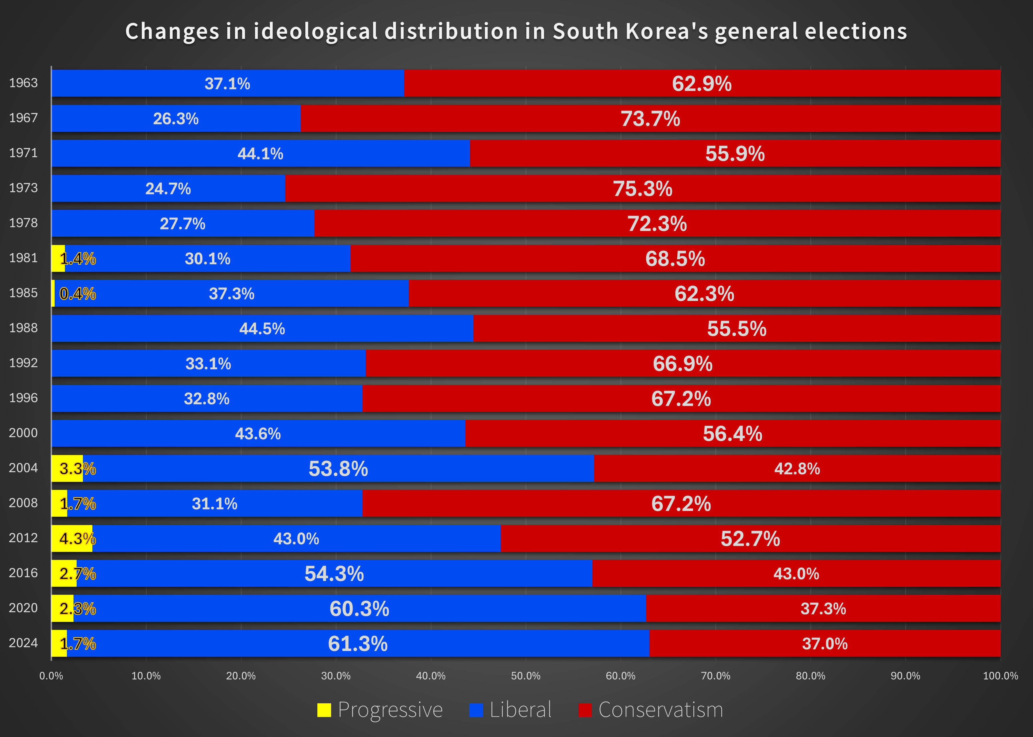 This graph shows the changes in the seat distribution of liberal parties (DPK and affiliated parties), conservative parties (PPP and affiliated parties), and progressive parties (Labor Party, Social Party, and nationalist left) in the 17 National Assembly elections held in the Republic of Korea since 1963.