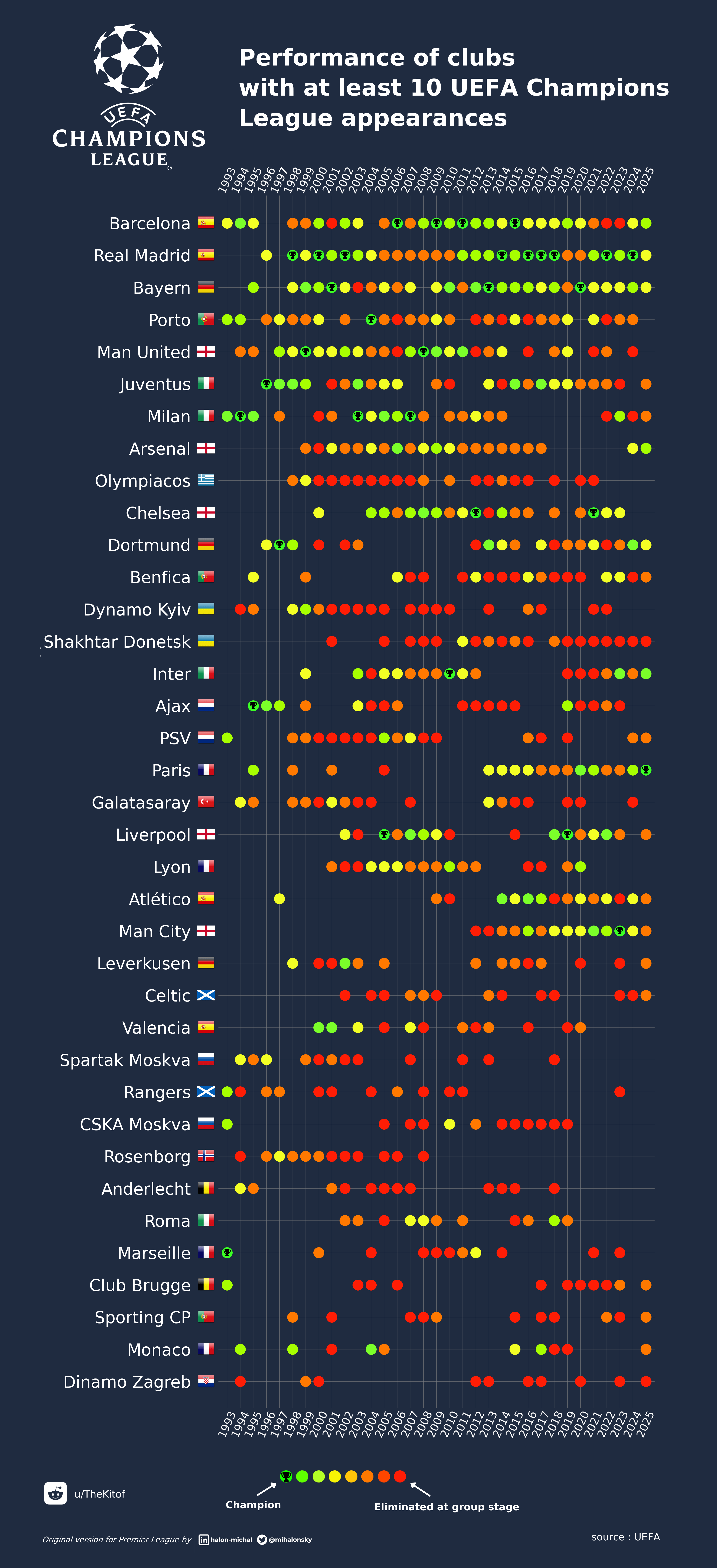 [OC] Performance of clubs with at least 10 UEFA Champions League appareances