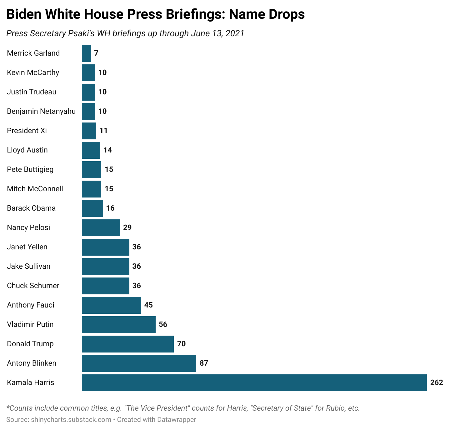 This includes about the same time period in the Biden administration (with Press Secretary Jen Psaki). One caveat is that this includes 89 briefings as opposed to the 30 done by Trump's admin in the same time period. I opted to keep the time period the same as opposed to the number of press briefings.