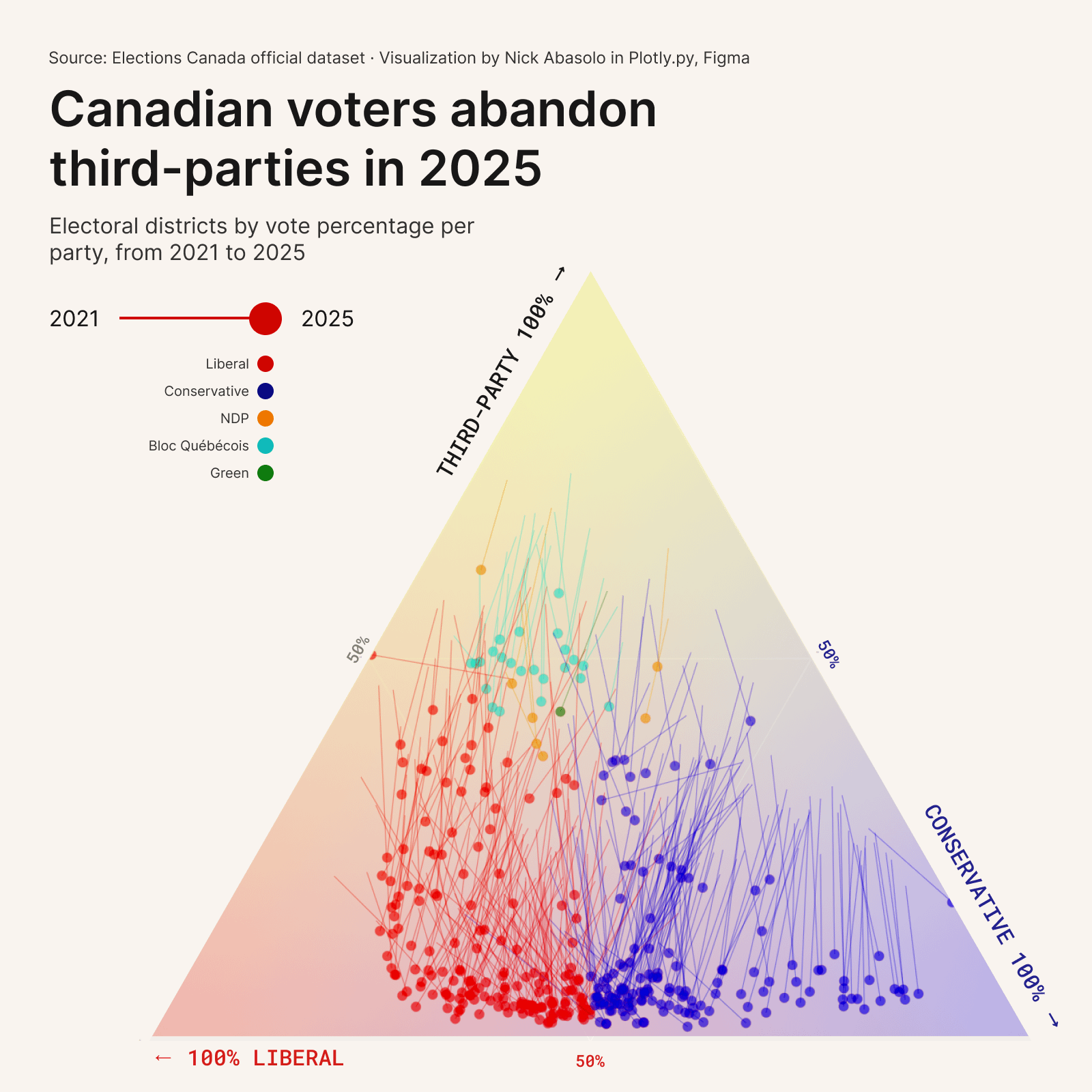 **Data:** Official datasets from Elections Canada. Note that 2021 results are based on Elections Canada’s official *transposed* data (due to a redistricting between elections, 2021 votes were mapped onto the new 2025 district boundaries).