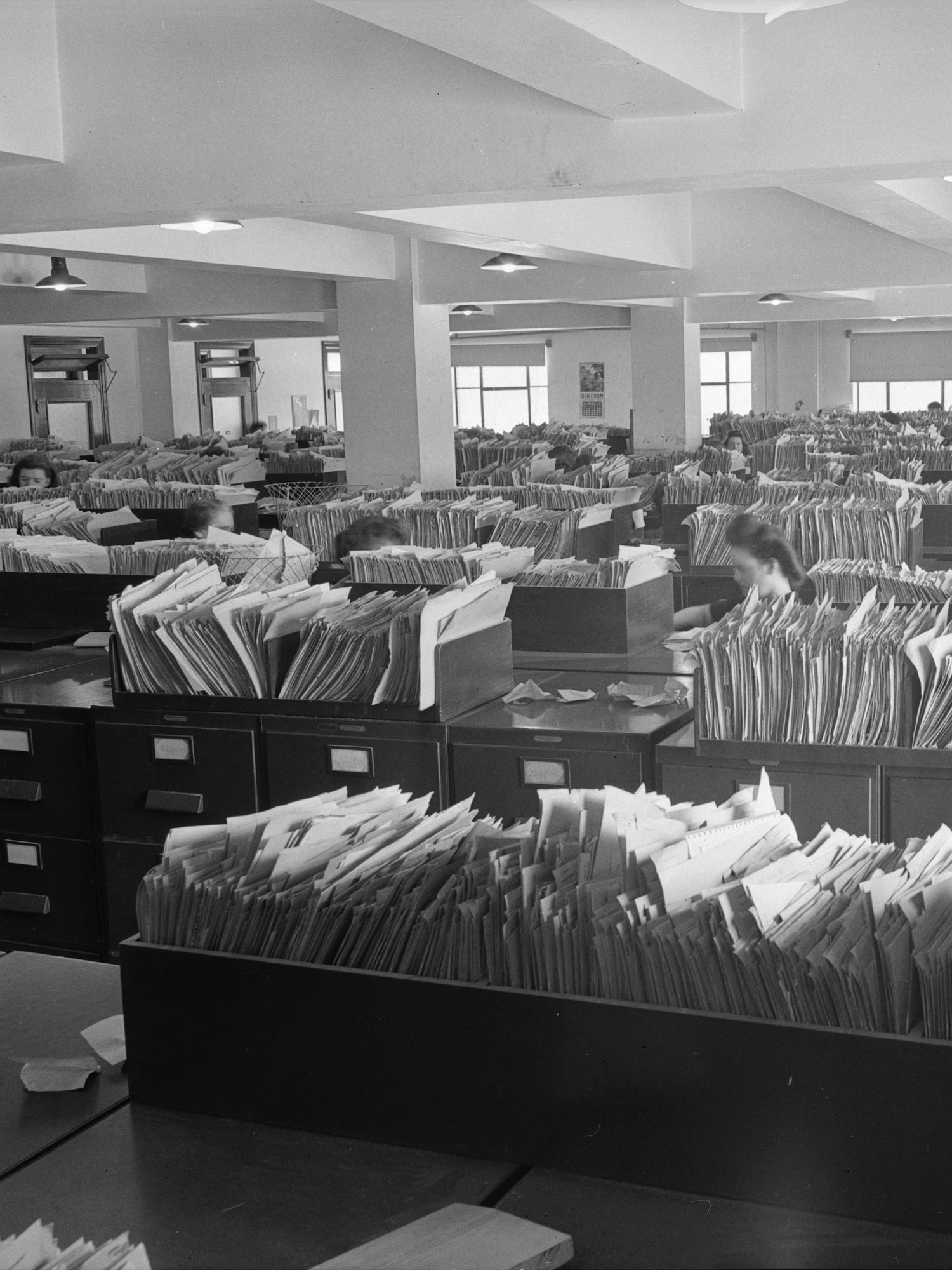 Government employees work behind mountains of paper in the Records and Files Department office of the Central Experimental Farm in Ottawa during the Second World War.