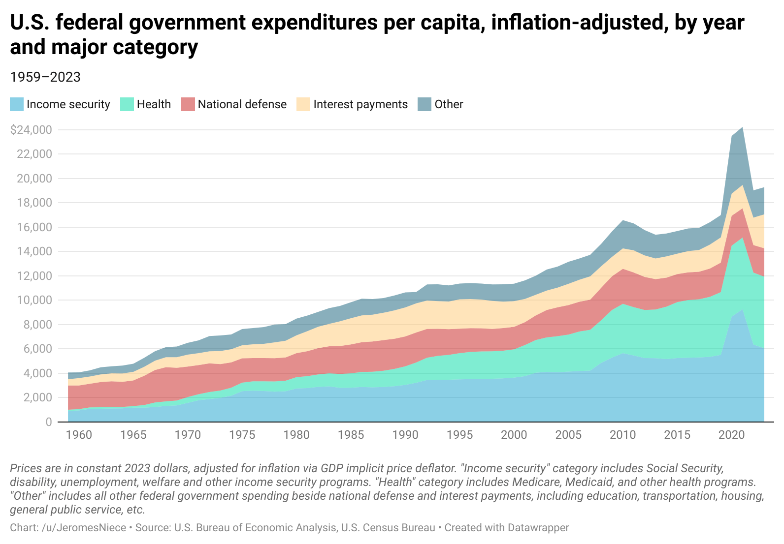 [OC] U.S. federal government expenditures per capita, inflation-adjusted, by year and major category