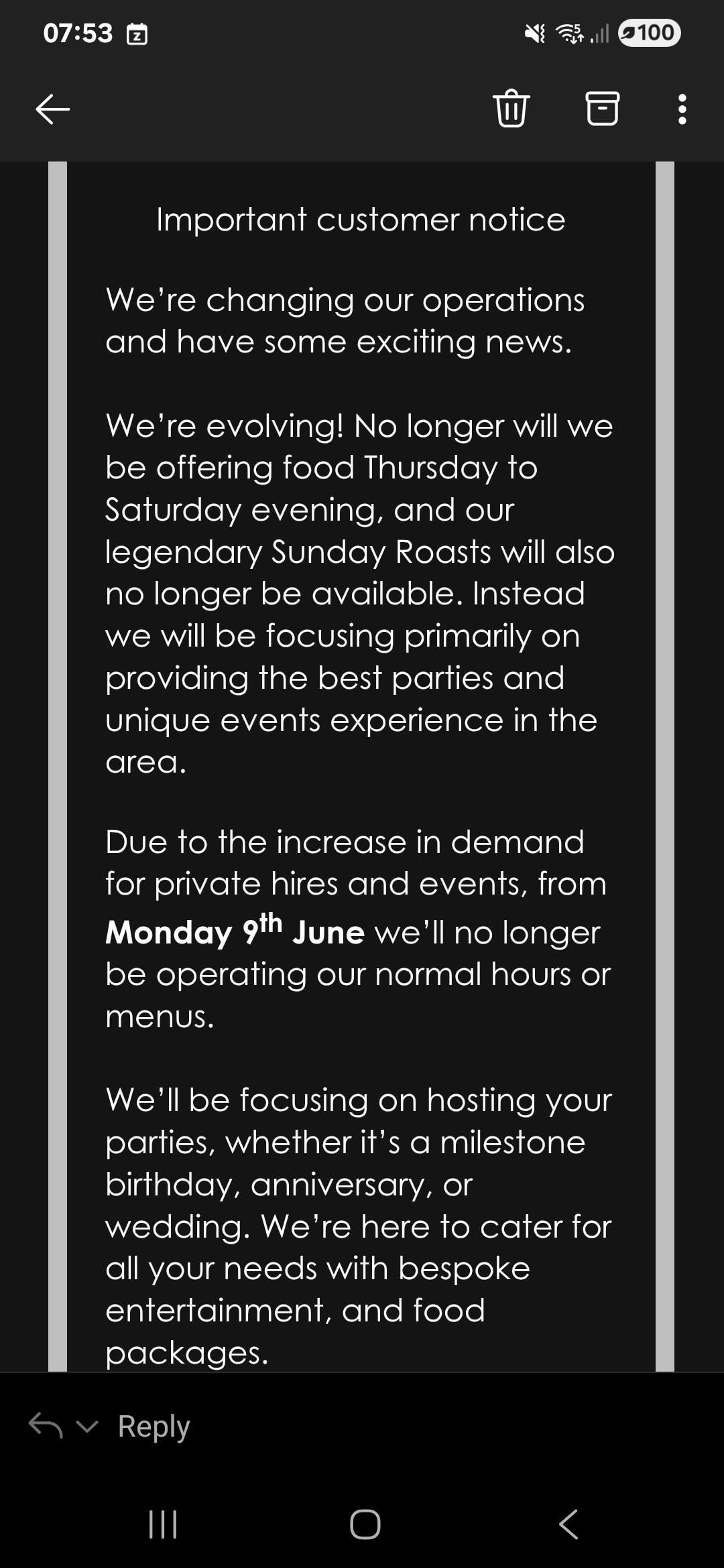 “our ‘legendary’ Sunday roasts will no longer be available”