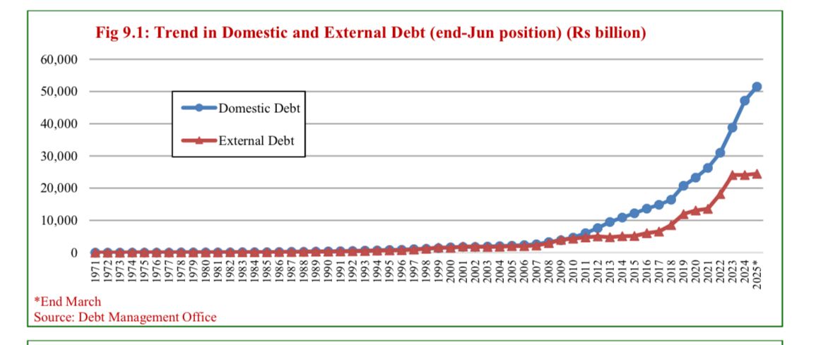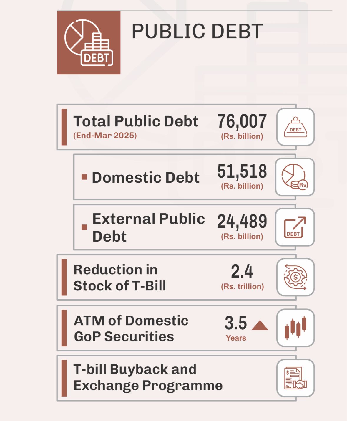 The Rs 76,007 Billion figure includes Rs 51,518 billion of domestic debt and Rs 24,489 billion of external debt. The Economic Survey of Pakistan has said that “excessive or poorly managed debt can pose serious vulnerabilities, such as rising interest burdens and can undermine long-term fiscal sustainability and economic security if left unaddressed.”