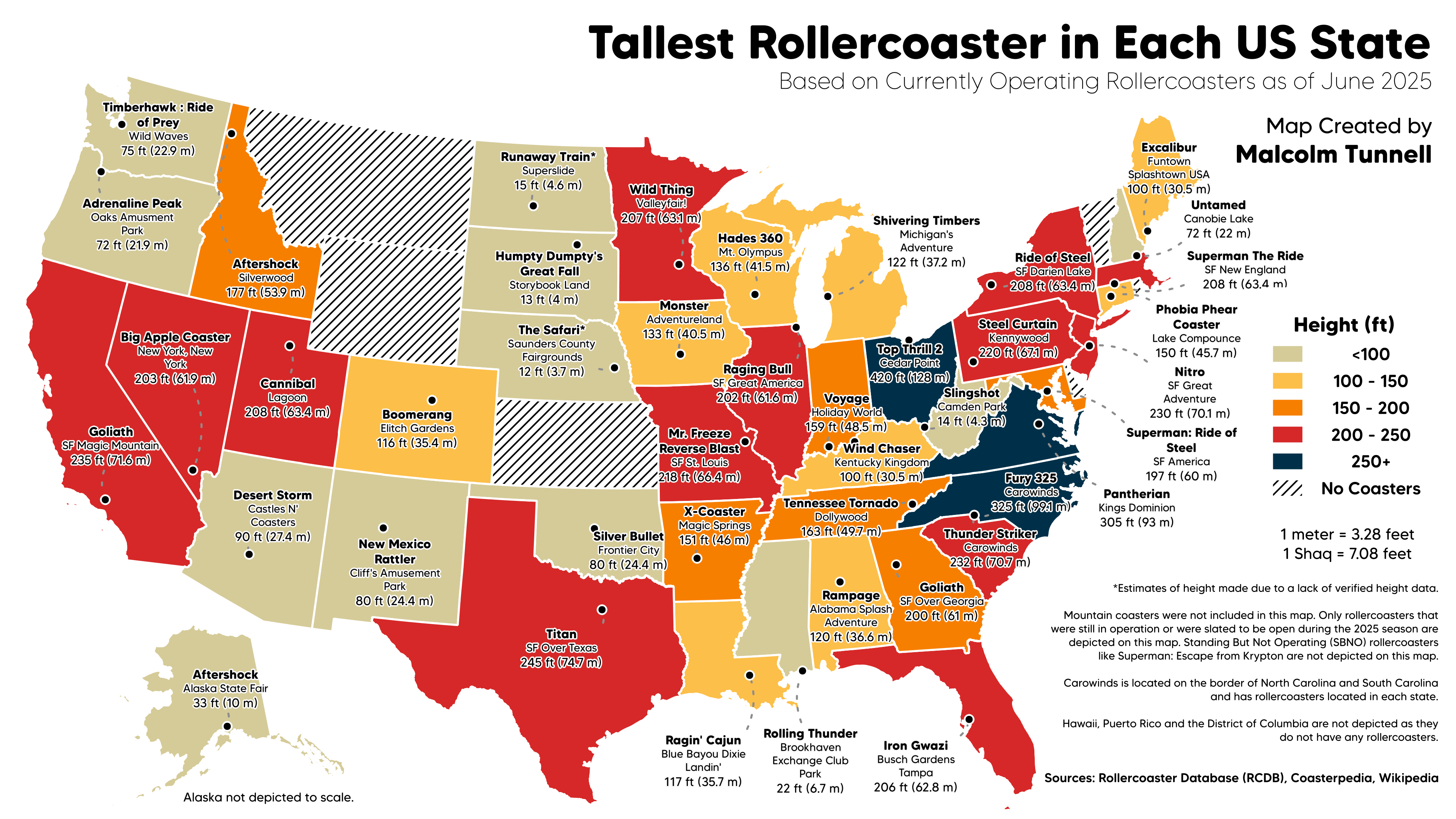 Notes: This map depicts the tallest rollercoaster in each US state. Mountain coasters were not included in this map. Only rollercoasters that were still in operation or were slated to be open during the 2025 season are depicted on this map. Standing But Not Operating (SBNO) Rollercoasters like Superman: Escape from Krypton are not depicted on this map. Carowinds is located on the border of North Carolina and South Carolina and has rollercoasters located in each state. Hawaii, Puerto Rico and the District of Columbia are not depicted as they do not have any rollercoasters. This is an update to one of the first maps I shared here on Reddit. With the recent closures of some of the tallest coasters in the US, I figured this map was due for a revisit! I’ve learned a lot since I first started when it comes to map-making. I hope that comes through in this map. As always, I’m open to any questions, comments or constructive feedback so if you have it, feel free to share! I try to respond as fast as I can! I hope you get something out of this map whether you are an enthusiast (thoosie?), a fan of maps/data, or just a casual Redditor! Thanks for the support from the community and be kind to each other in the comments 🙂