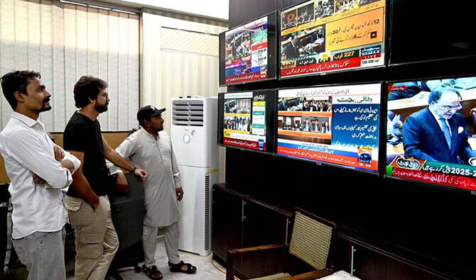 Corporate employees watching television screens during presentation of Pakistan’s $62 billion federal budget for fiscal year 2025–26, in Islamabad. (APP)