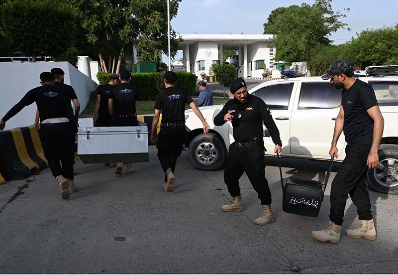 Security personnel shift boxes with copies of the 2025–26 fiscal budget outside the Parliament House in Islamabad, before the start of the budget session. (APP)