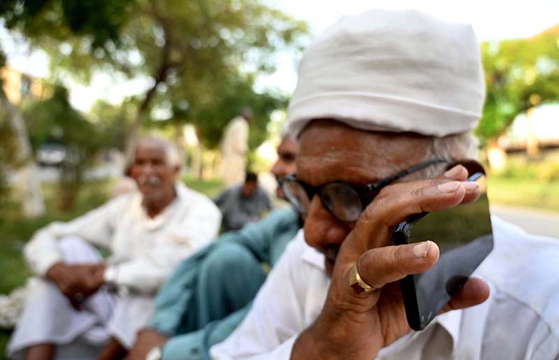 An elder man listening the 2025-26 federal budget speech live on his mobile phone at a roadside in Islamabad. (APP)