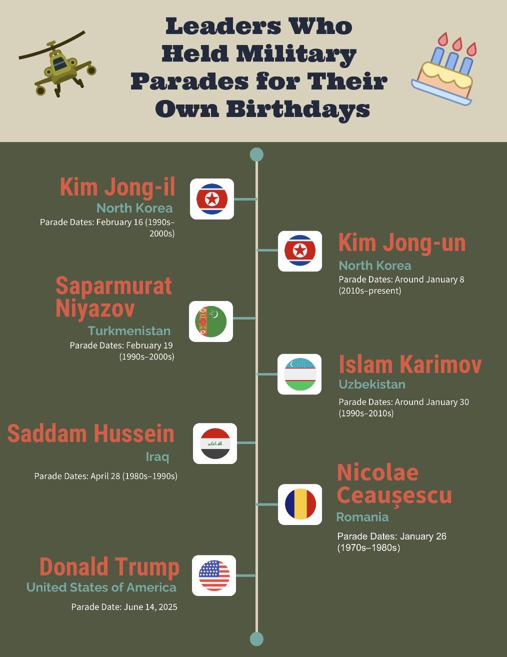 Between the 1970s and 2025, at least eight world leaders across Asia, the Middle East, Eastern Europe, and the United States have held military parades to mark their own birthdays — often as tools of state propaganda, personal glorification, or regime-strengthening rituals.