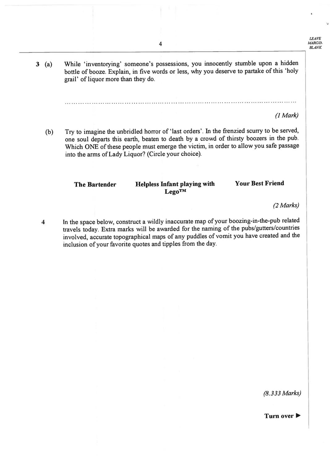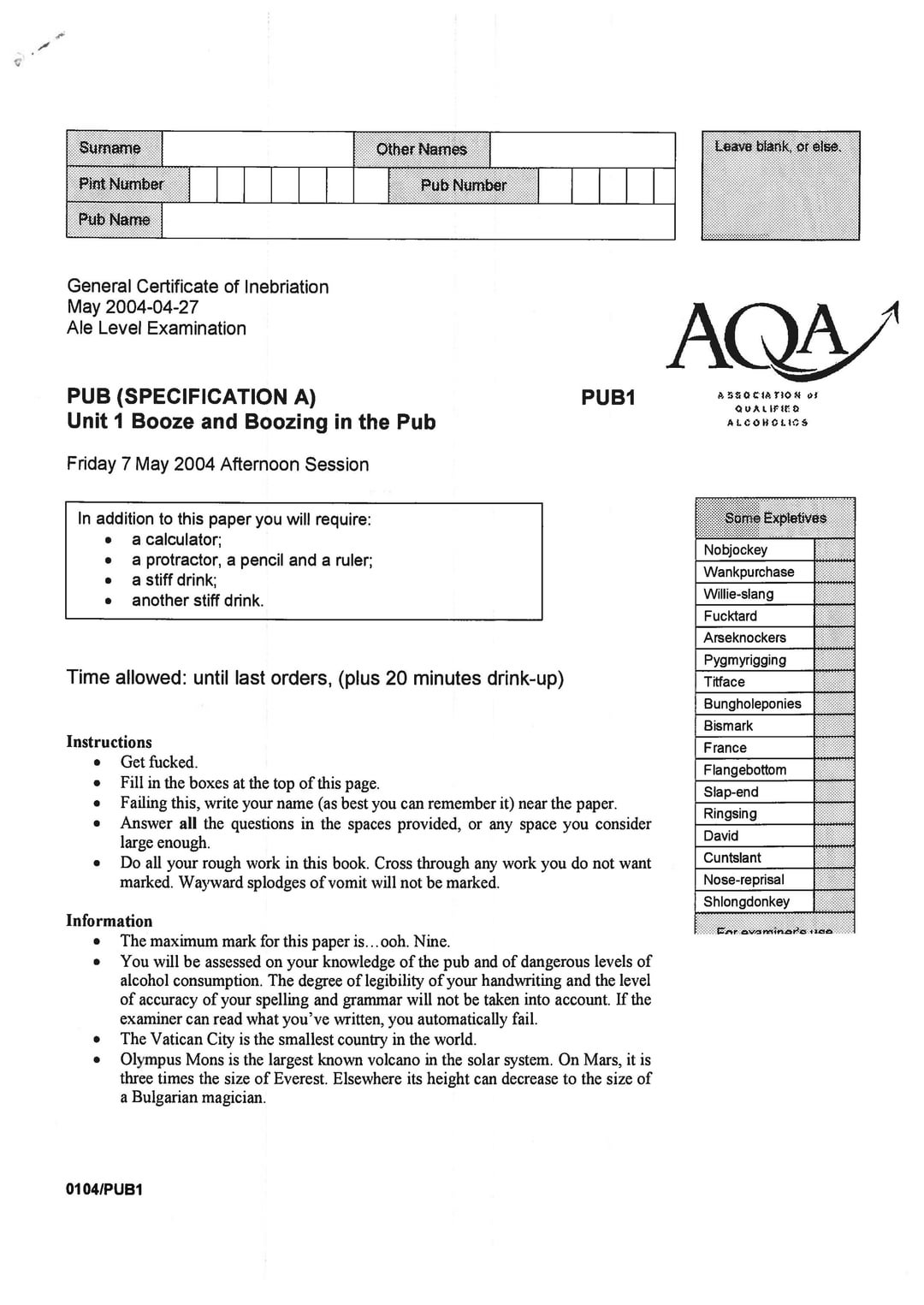 I unearthed and scanned an old “activity sheet” a friend and I made up for our A Level results pub crawl back in 2004. It’s an elaborate (fake) AQA exam paper for the “Ale Level” module “Booze and Boozing in the Pub”. It’s extremely sweary. Enjoy!