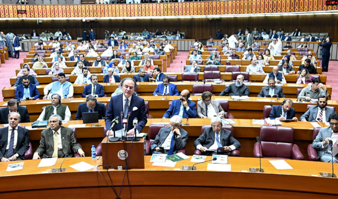This handout photograph taken on June 10, 2025, and released by Pakistan’s National Assembly shows Finance Minister Muhammad Aurangzeb presenting the 2025–26 fiscal budget at the Parliament House in Islamabad. (AFP)