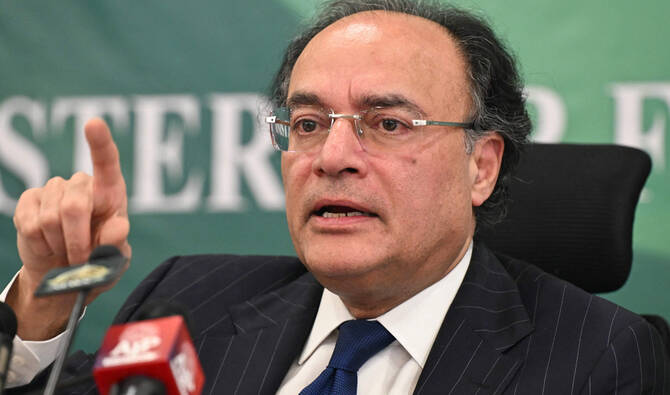 Pakistan’s Finance Minister Muhammad Aurangzeb speaks during a media briefing in Islamabad on June 11, 2025, a day after presenting the 2025–26 fiscal budget. (AFP)