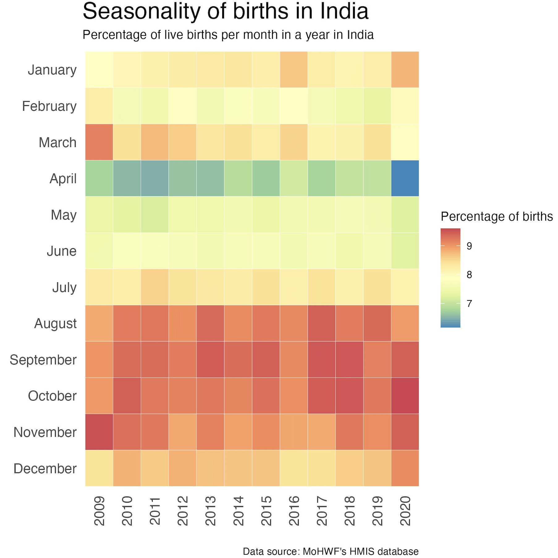 Love this! April being the lowest concentration of births every year since 2009 is fascinating. Now to figure out the reason why Indian folks don’t be f*ckin in July…