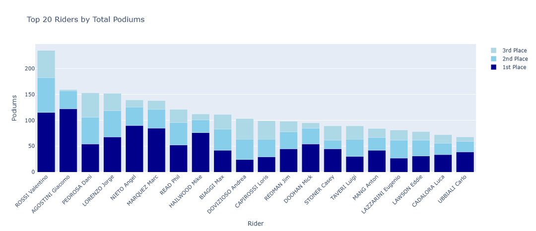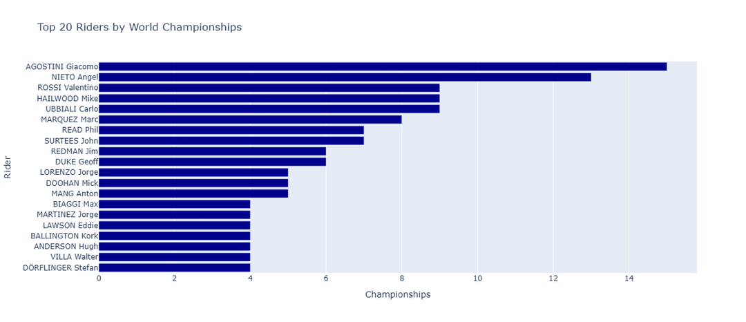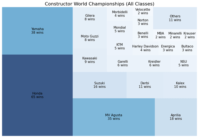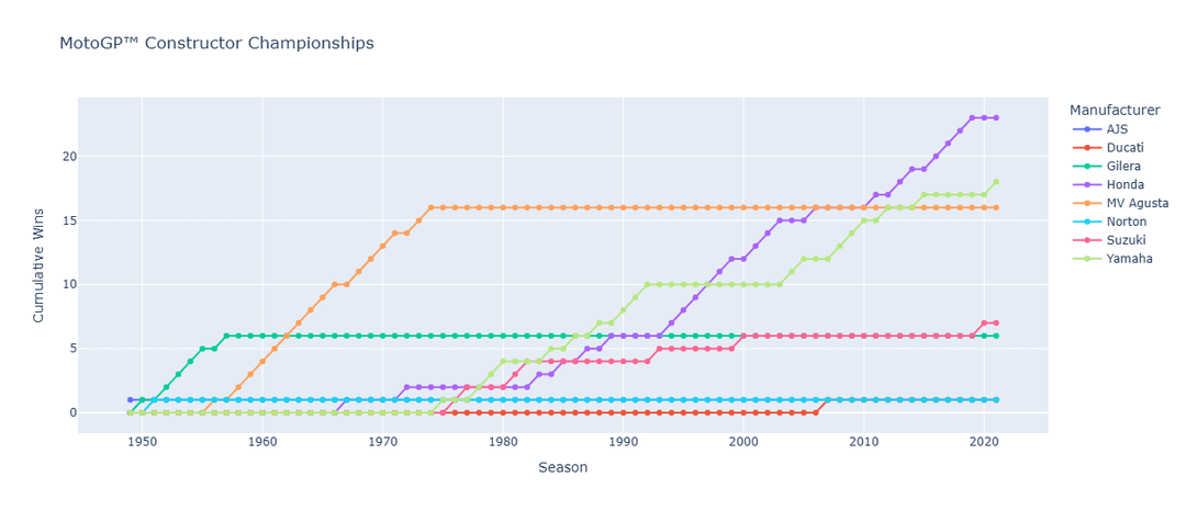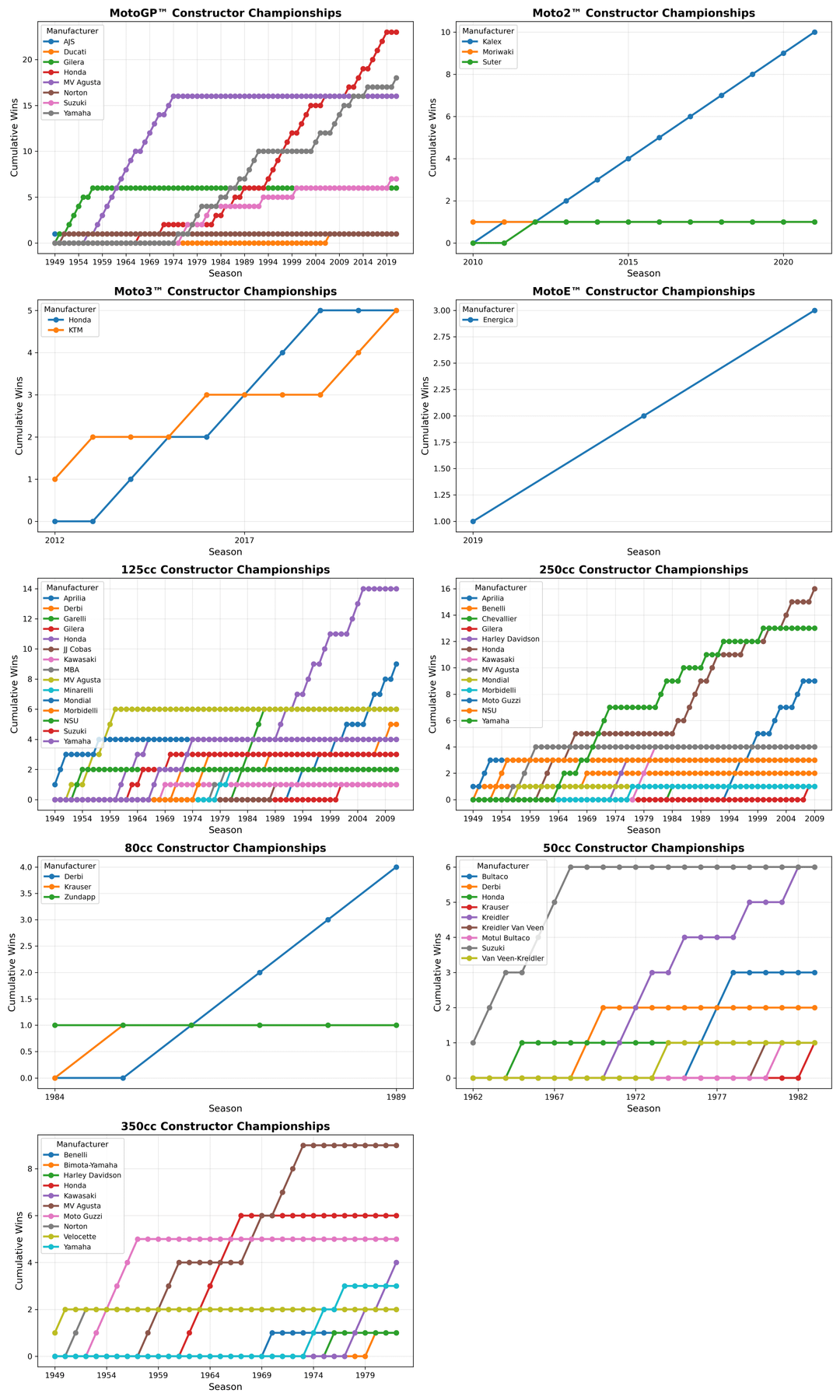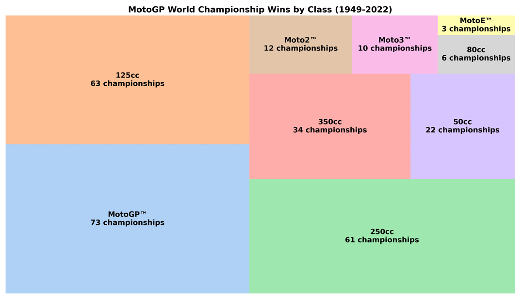I recently completed an analysis of the MotoGP World Championship from 1949 to 2022, covering over seven decades of racing history. Using Python (Pandas, Matplotlib, Seaborn, Plotly, etc.), I created a series of visualizations that reveal long-term trends and interesting insights.