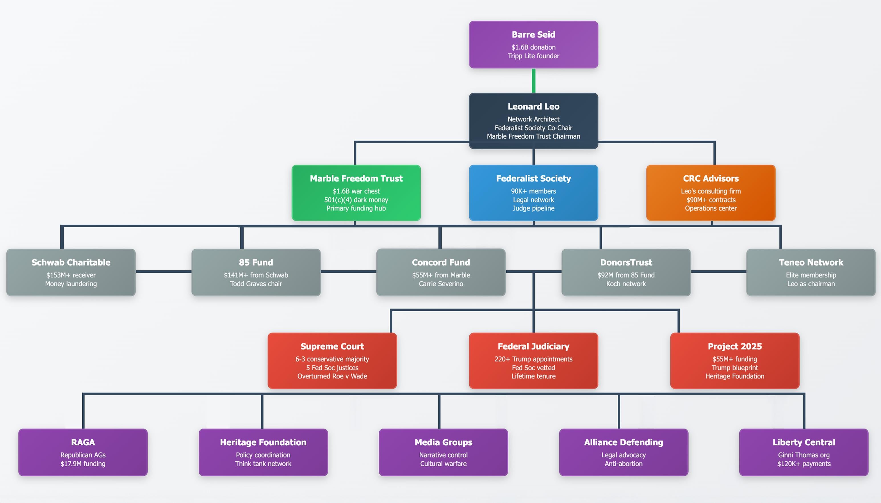 [OC] A visual map of Leonard Leo’s dark money and legal influence network that reshaped the American judiciary
