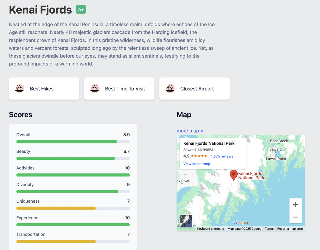 I was literally at Kenai Fjords just last week. It is not #1, let alone an A+ compared to the other parks. Cool place, but not even Top Ten.