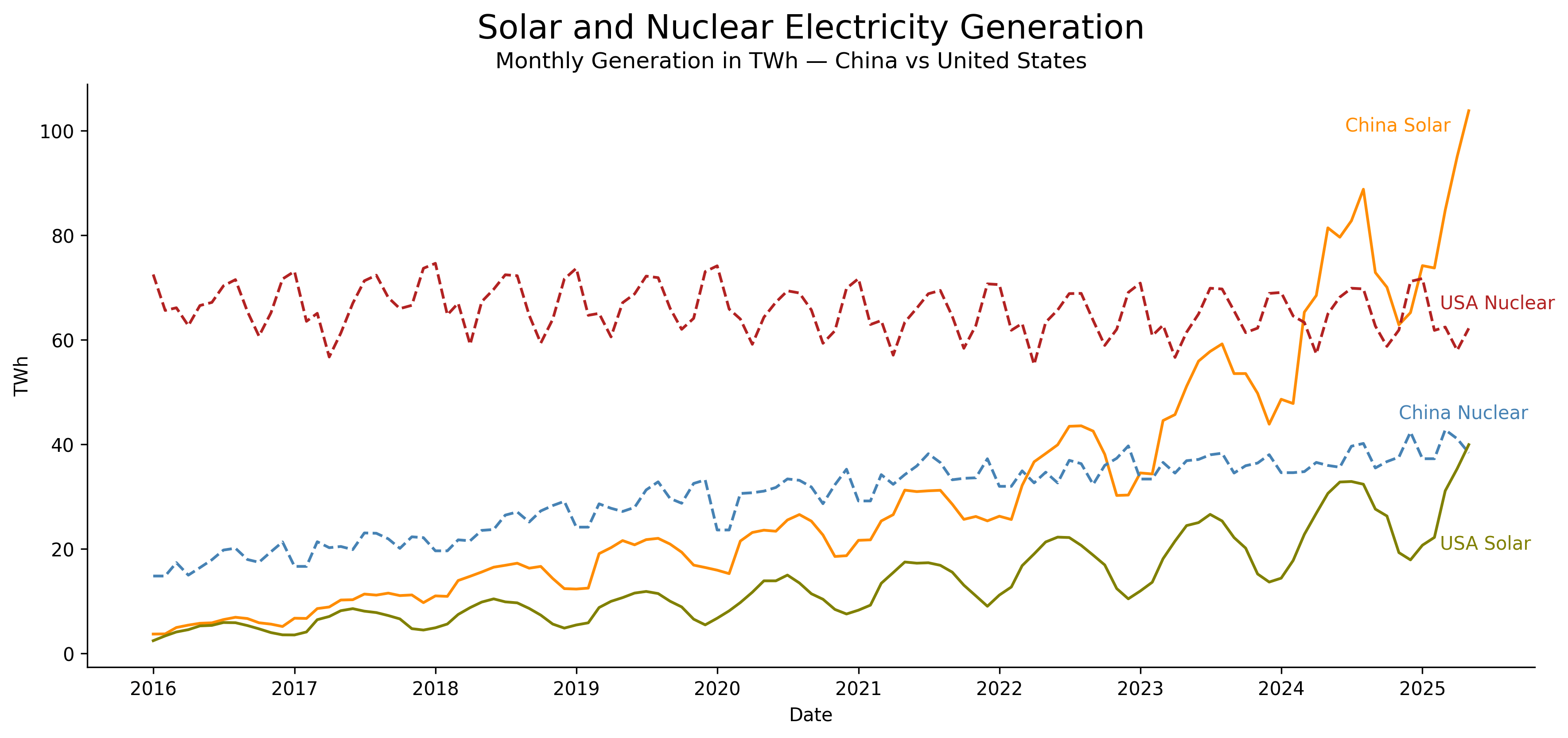 Interesting. I wonder if the graph would be faster to interpret if you had both lines from china (and likewise for USA) be the same color, but keep solar and nuclear different line styles.