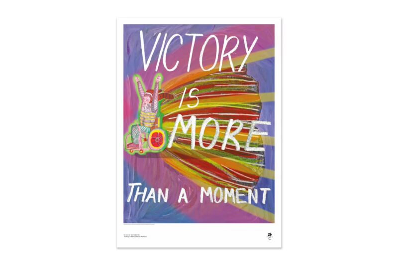 Clara Woods, a young artist with global acclaim, channels poetic abstraction in her work—layering color, motion, and emotion into a composition that feels both vulnerable and mighty. Giulia Mangoni’s tribute to the now-iconic moment between Braima Suncar Dabo and Jonathan Busby at the 2019 World Championships in Doha reminds viewers that the Paralympics are not solely about competition—they are about compassion, humanity, and endurance. Through text and texture, each piece tells a story that resonates far beyond the arena.