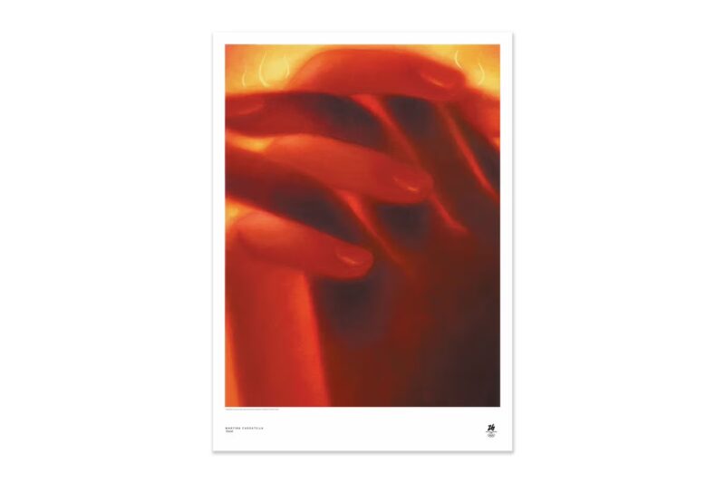 Beatrice Alici’s piece evokes serenity and softness, depicting a snow-covered slope bathed in light—an almost dreamlike interpretation of skiing that speaks to inner calm as much as physical skill. Martina Cassatella’s fiery hand-as-torch design reinterprets the torch relay as a literal extension of the athlete’s spirit—bold, raw, and elemental. Giorgia Garzilli takes a whimsical approach with Olympic rings made of gelato scoops, tapping into Italian pop culture with nostalgic flair. Maddalena Tesser offers an intimate, abstract take on movement and form, while Flaminia Veronesi blends myth and modernity into a surreal, colorful tableau of ice and action.