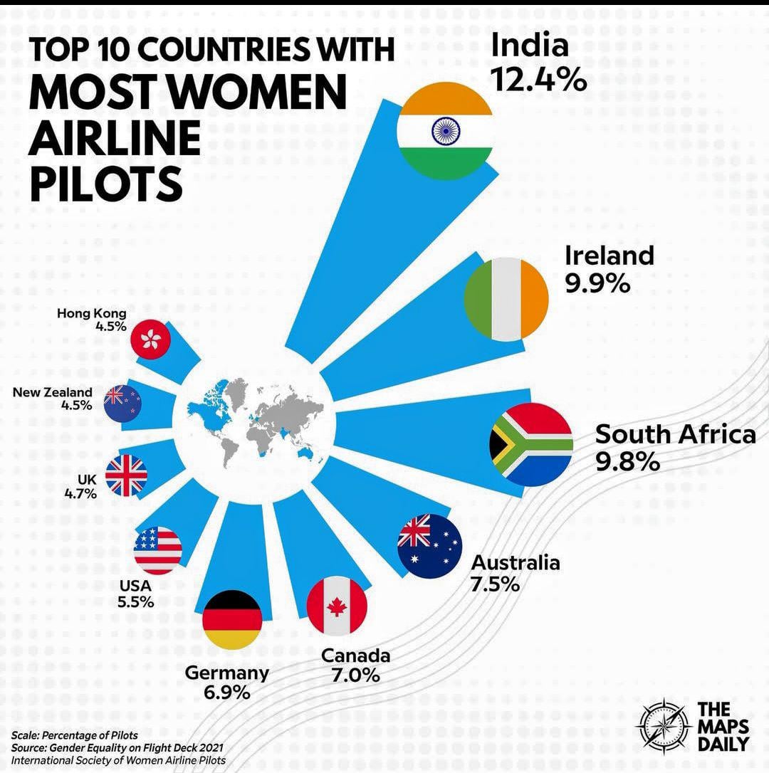 Misleading. India has a high PERCENTAGE of female pilots because there are so few pilots (only 10k) so only about 1,200 total female pilots