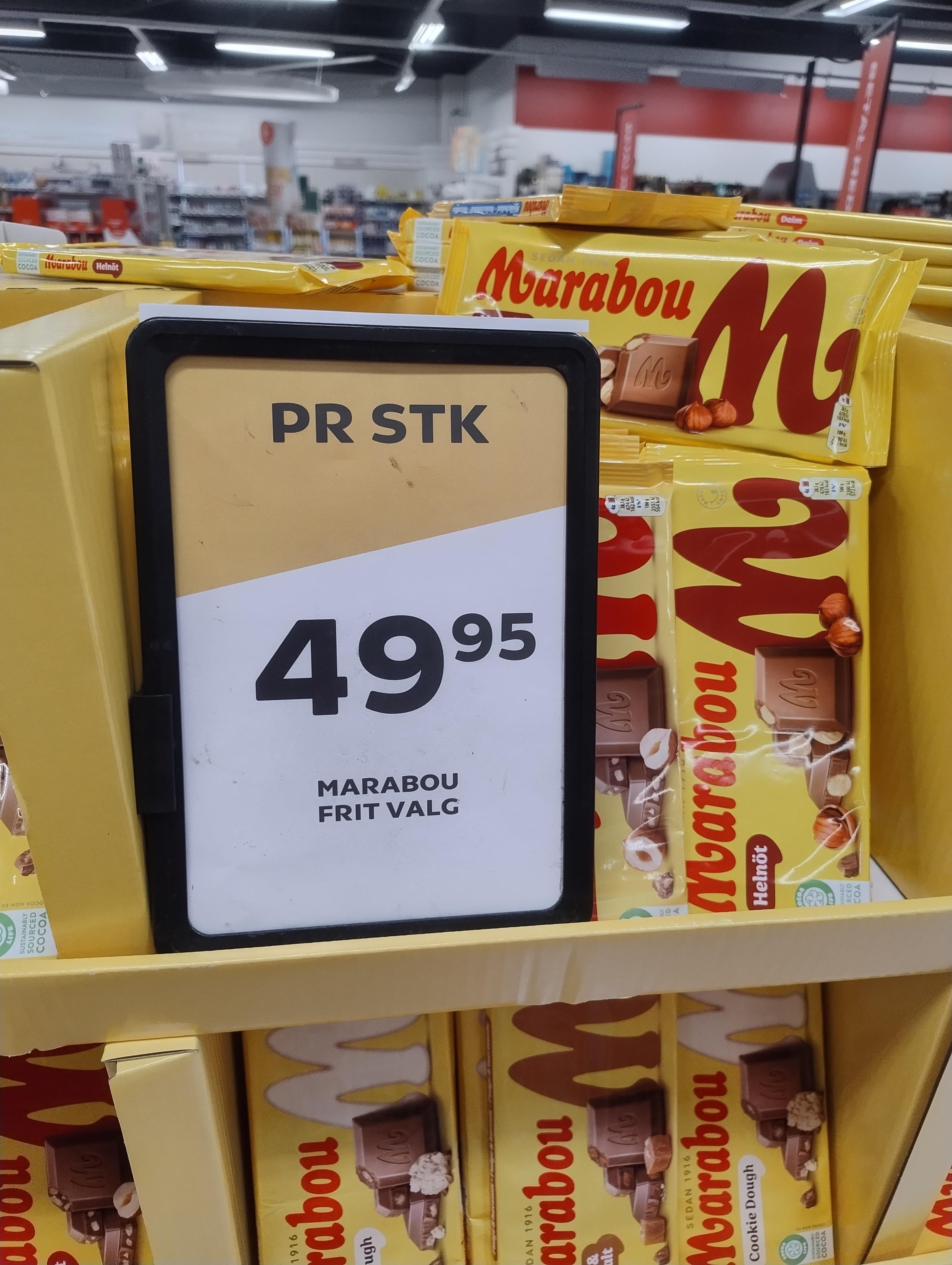 12. Jeg kan desværre ikke sætte billedet ind her i en kommentar, men jeg tog et foto af hyldeforkanten til en plade Marabou 300 g. i vores lokale Superbrugs i januar i år. Den kostede 73,50