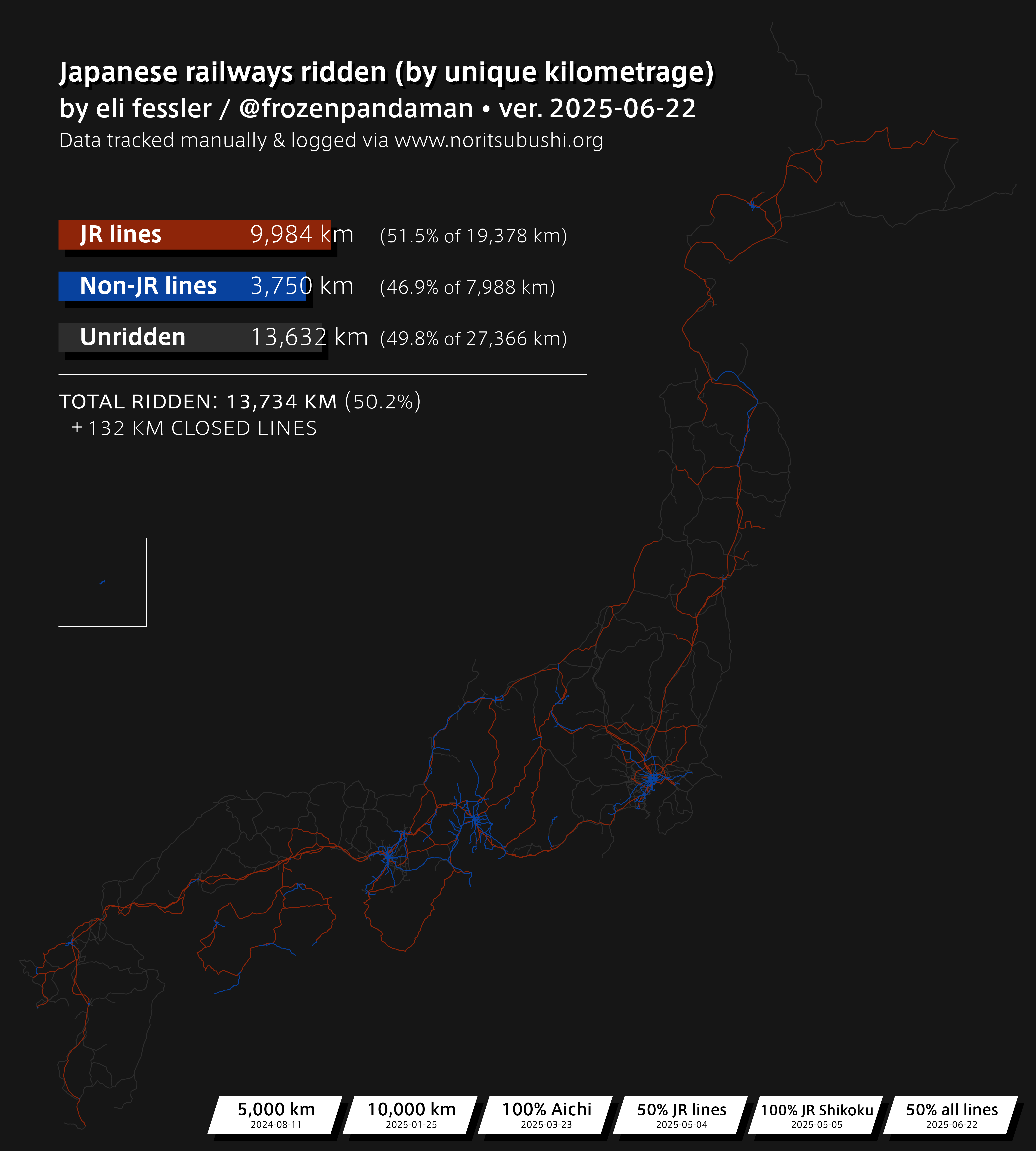 [OC] As of this weekend, I’ve now ridden over half of Japan’s train network, having traveled 13,734 unique km on railways across the country!