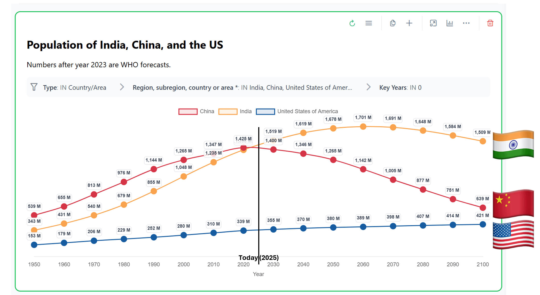 This graph chart greatly overestimates the future population of India while underestimating that of China, which is unlikely to align with future trends.