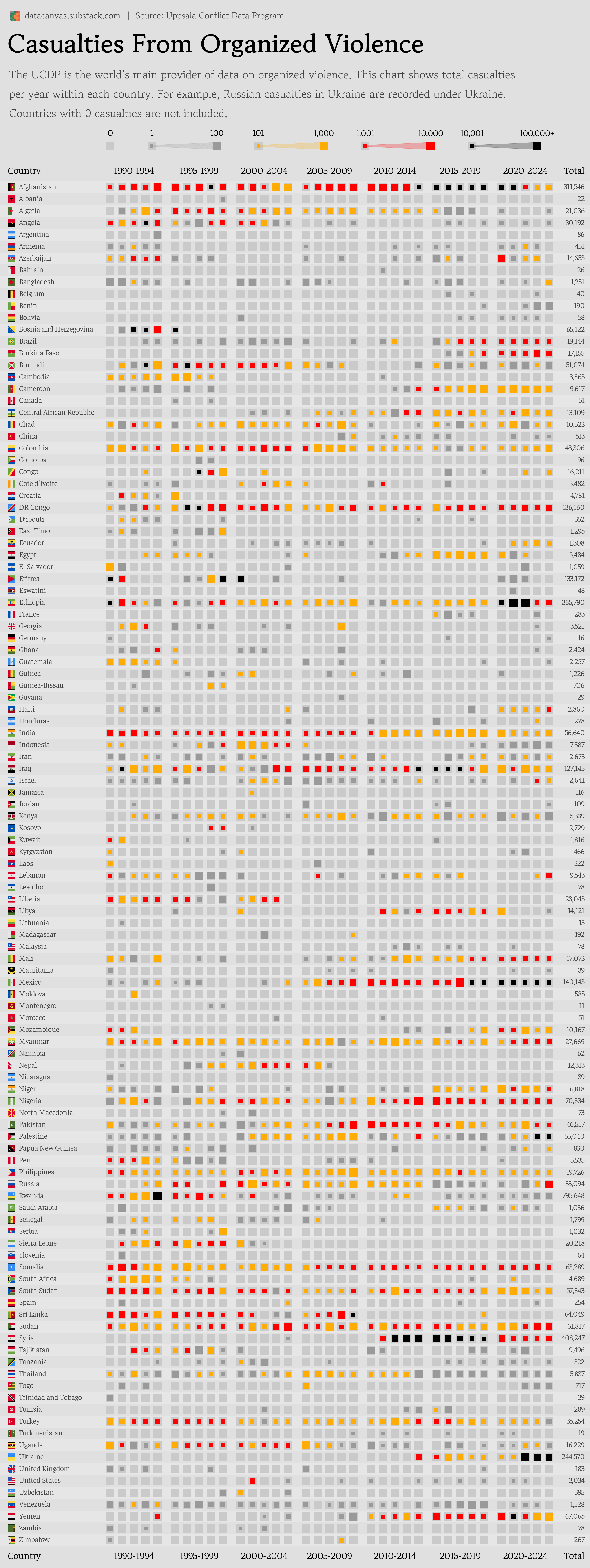 I suspect that many of us looked for the countries in which there were high casualty counts. I suggest that you make a variant on this where the lines are sorted by number of casualties (high counts at the top). You could also sort by casualty to population ratio (perhaps using 1990 populations).