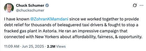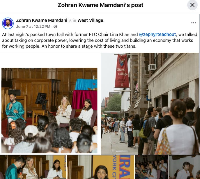 Yesterday, Zohran Mamdani, a 33 year-old Democratic socialist, shocked the political establishment by winning the Democratic primary in the contest to become the next mayor of New York City, riding a wave of young voters angry about the cost of living to defeat the entrenched party machine that has controlled New York politics for decades. I’m going to write about his win, because one of the people at his victory party was former Federal Trade Commission Chair Lina Khan. And there’s a reason for that.