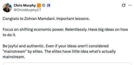 This system election seems different, stronger, more meaningful. Mamdani didn’t self-fund, he was outspent dramatically, winning anyway with the power of his arguments. It wasn’t just Mamdani; populists did well in lots of elections in New York. There really is a new voter universe, young people frustrated over affordability, and not just angry over partisan affiliations. It’s a system defining election because it’s likely the coalition of voters behind Mamdani exists in every state and city, with varying degrees of strength. There are also different ideas to play with, and a broad frustration with the arc of American foreign and domestic policy, and a real economic governing agenda in the form of anti-monopoly proposals and industrial policy.