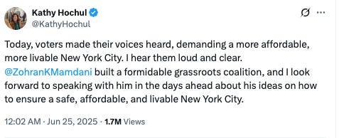 System defining elections influence more than just the actual contest at issue; the establishment moves to try to stay relevant. New York Governor Kathy Hochul, for instance, who is an ardent corporatist, is already doing that in response to Mamdani’s win. Other key Democrats – from New York and elsewhere – are chiming in as well.