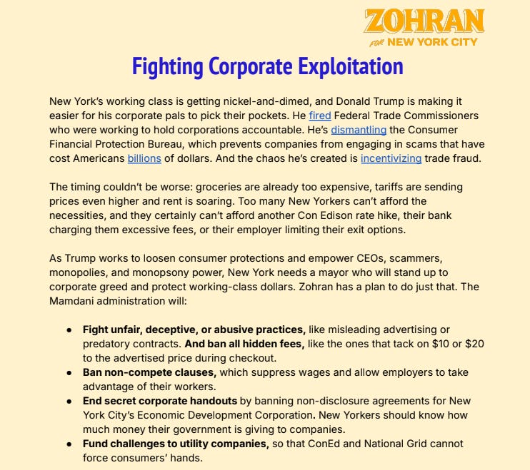 By contrast, despite the Democratic socialist label, Mamdani linked his campaign with anti-monopoly arguments, focusing on the cost of living and blaming well-known villains like the utility giant Con Edison, suggesting that the city fund challenges to the utility’s rate increases in dockets. He proposed a ban on non-compete agreements in New York City, which was one of the core goals of former Federal Trade Commission Chair Lina Khan. And he discussed ending junk fees and predatory contracts. Here’s one plank of his campaign platform.