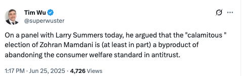 Mamdani also proposed opening up five city-operated grocery stores to address food deserts, which is a way of taking on a problem caused by price discrimination. City-owned stores, which is not particularly different than commissaries the military used to run on bases, are generally hated by independent grocers for ideological reasons. But they could provide a platform for the city itself to file Robinson-Patman cases against price discrimination by the large packaged goods companies, which would fix the problem that independent grocers have. New York City can afford a lawsuit like that, and isn’t intimidated by a Walmart-style giant the way a small store might be. Or city stores could just be an operational disaster. Mamdani is untested as a leader of large-scale organizations, and New York City is just massive. We don’t know how he’d do as mayor, or even if he’ll win the general election.