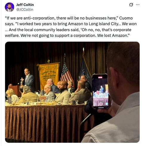 Cuomo ran as a basic corporate labor Democrat, supporting a higher minimum wage and offering access to unions and big business, while also arguing that he was competent and the left was crazy. At an IBEW event three days ago, for instance, he said that his attempt as Governor in 2019 to lure Amazon’s second headquarters with corporate subsidies was a model for the city, and that the refusal of local leaders to accept his deal was disastrous. “We lost Amazon,” he lamented.