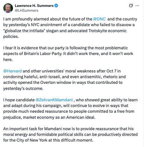 They also fear this dynamic, correctly, as going far beyond New York. Summers, who is a spokesman for economic elites, claimed that the “calamitous” election of Mamdani is a “byproduct of abandoning the consumer welfare standard in antitrust.” It’s a silly point in and of itself, but it shows that Summers believes that there is a larger ideological meaning to this race.