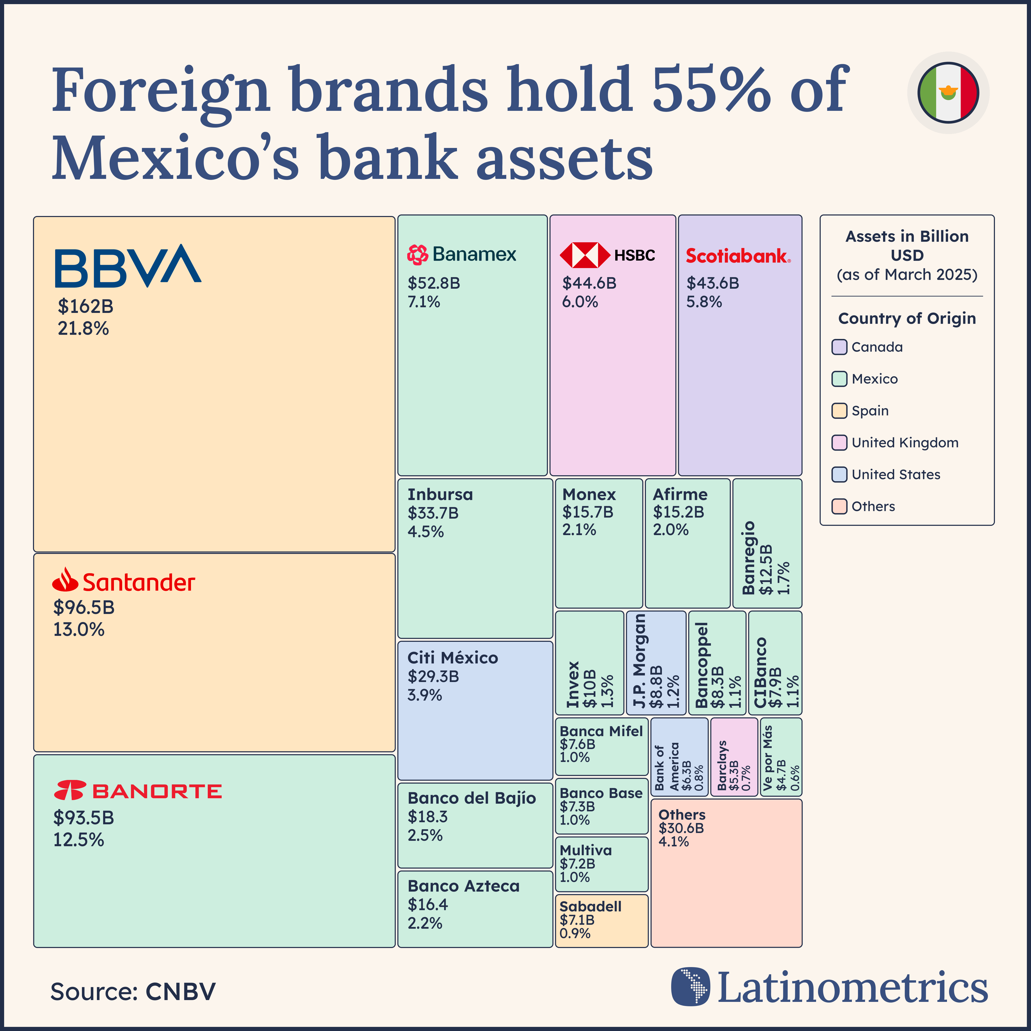 Of the six largest Mexican banks, for example, four are subsidiaries of foreign financial institutions. Spanish giants like BBVA and Santander are the dominant national players, together holding over a third of all banking assets in the country.