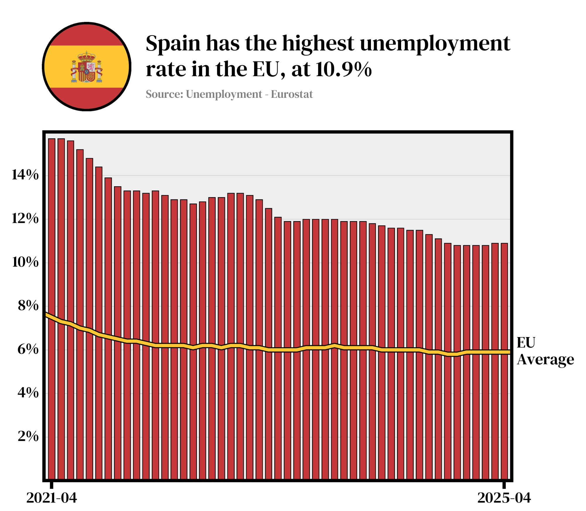 The youth unemployment rate for people under 25 in Spain remains chronically high at 26%.