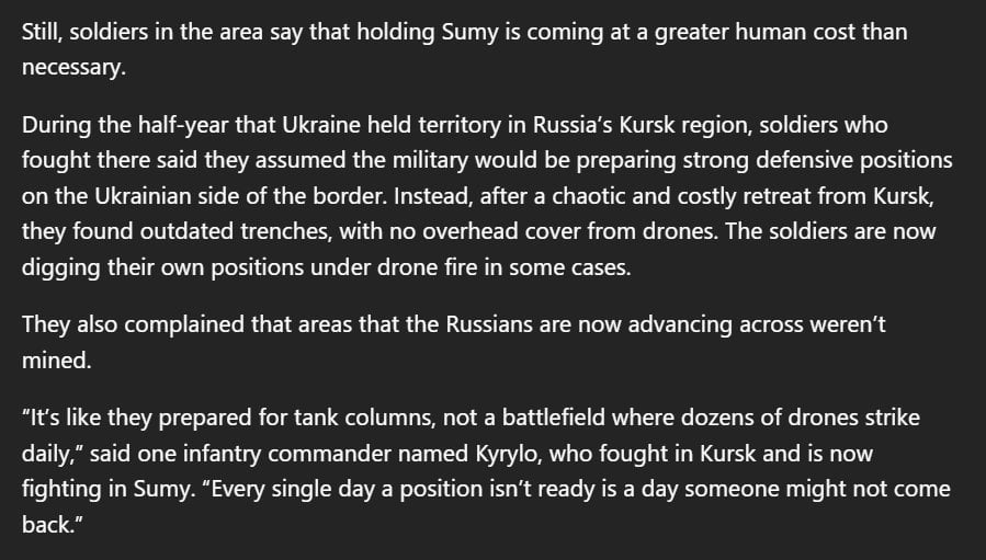 When Ukraine held territory in Kursk, soldiers who fought there said they assumed the military was preparing strong defensive positions on Ukrainian side of the border. Instead, after a chaotic retreat from Kursk, they found outdated trenches with no overhead cover from drones, & no mine fields laid