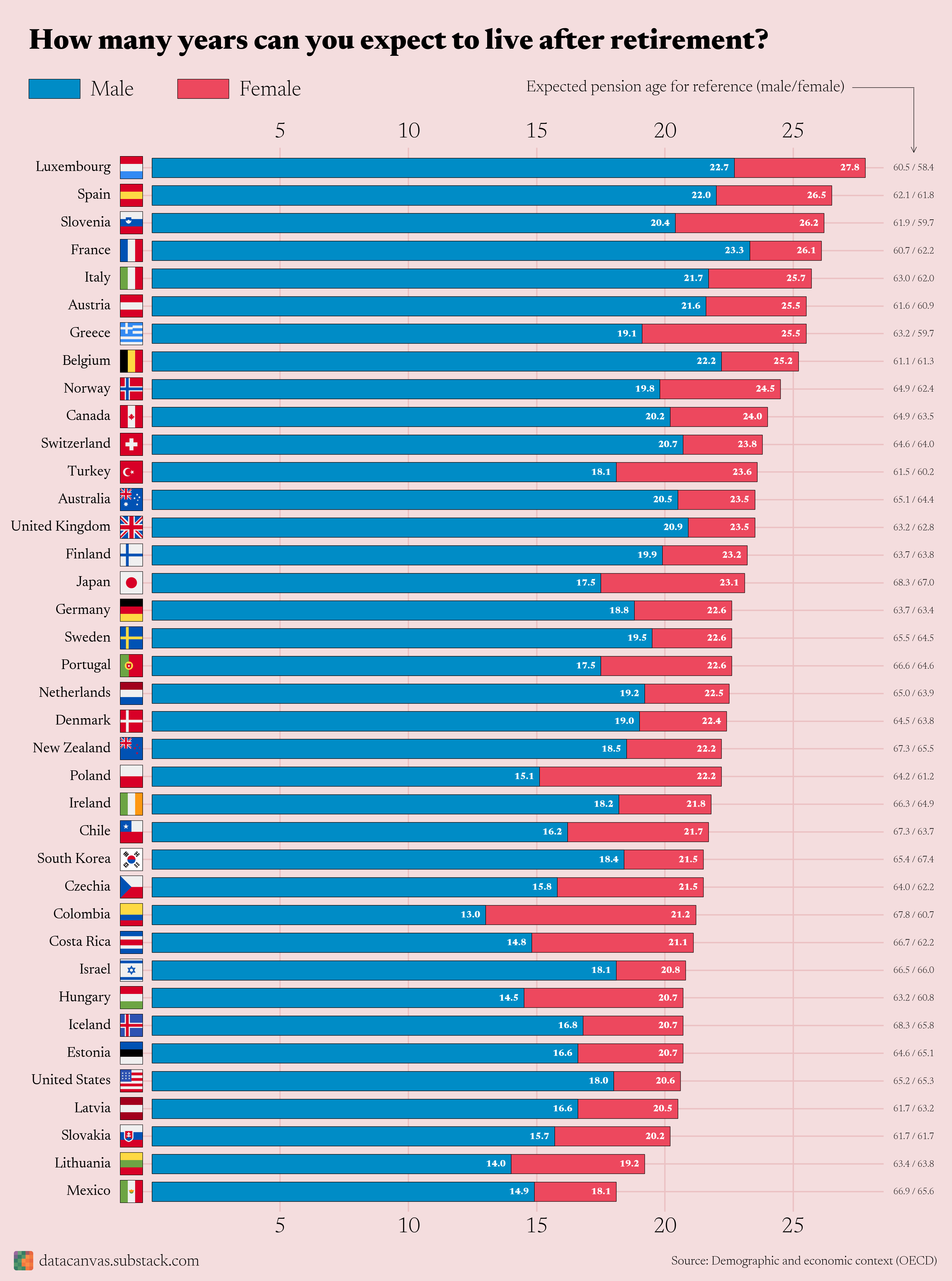 14. It would be interesting to see the pension age included on the bar graph. Then you could see both the life expectancy effect by country, as well as the retirement age effect. Some of the differences are simply because certain countries retire much later than others (and have similar life expectancy).