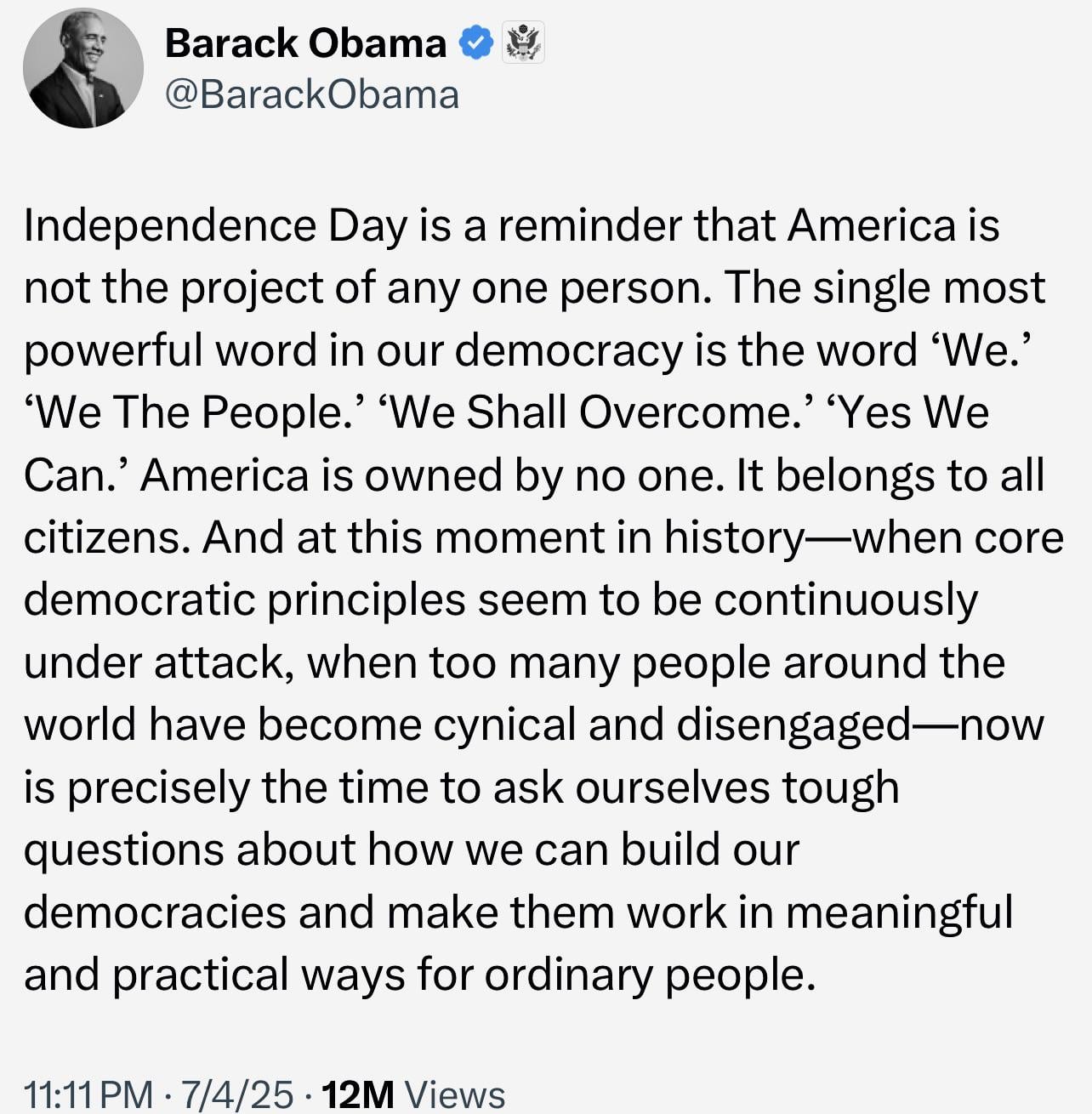 This is what a real President sounds like. Unlike the current occupant of the White House, President Barack Obama showed care and respect for all Americans—not just one political party. Happy 4th of July!