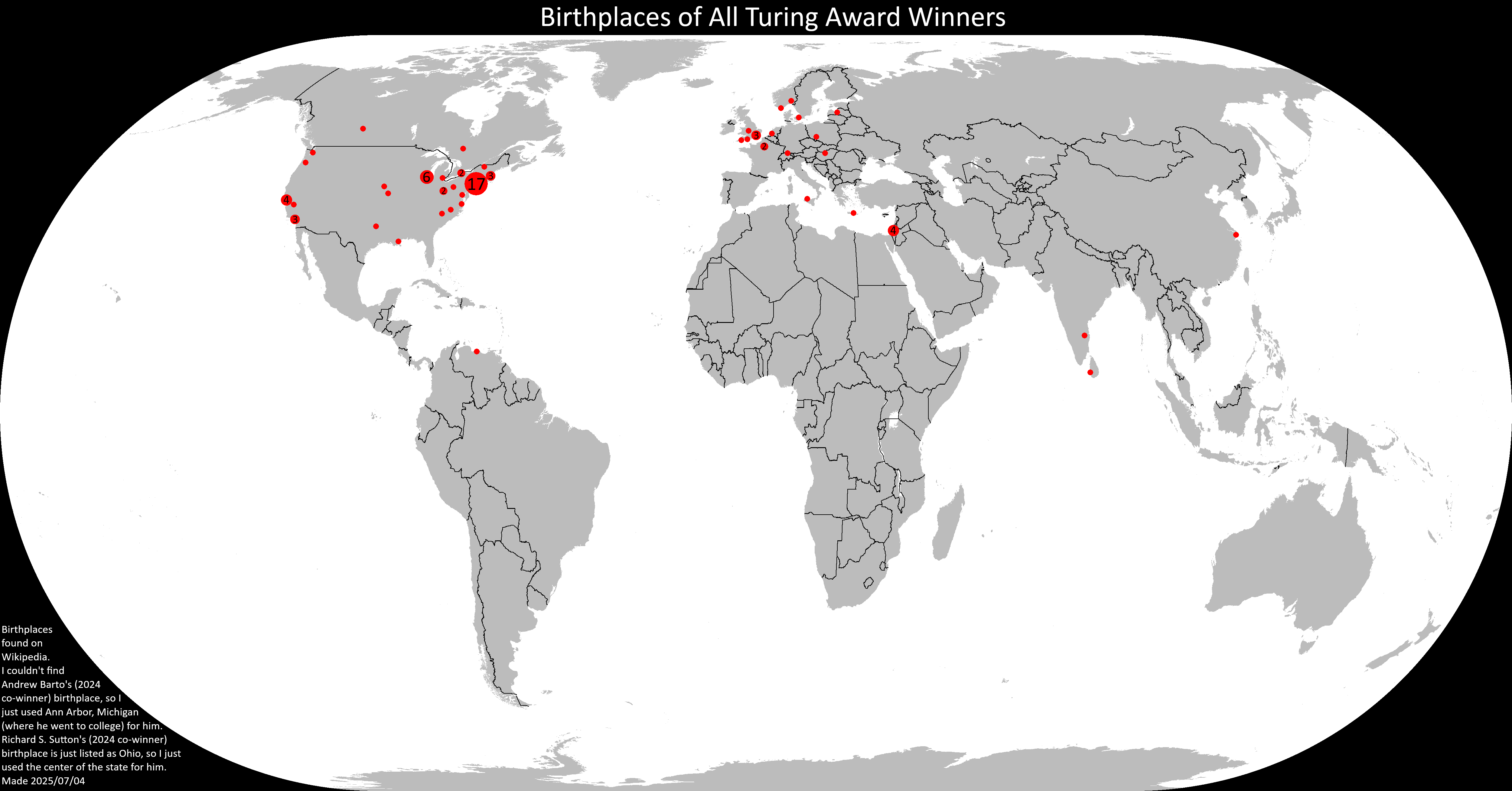 1. I got (most of) the birthplaces from Wikipedia, using the wikidata query from this blogpost (but for the Turing Award instead of the Field’s Medal): https://efosong.net/blog/nobel-birthplace/