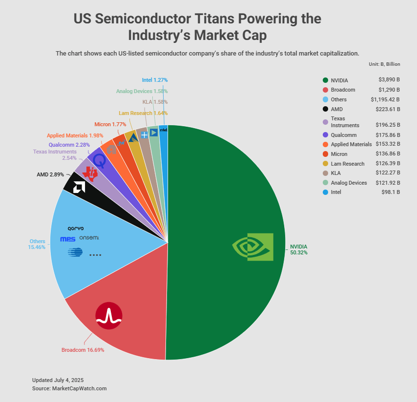 The chart shows each US-listed semiconductor company’s share of the industry’s total market capitalization, highlighting how market value is distributed among the sector’s leading players.