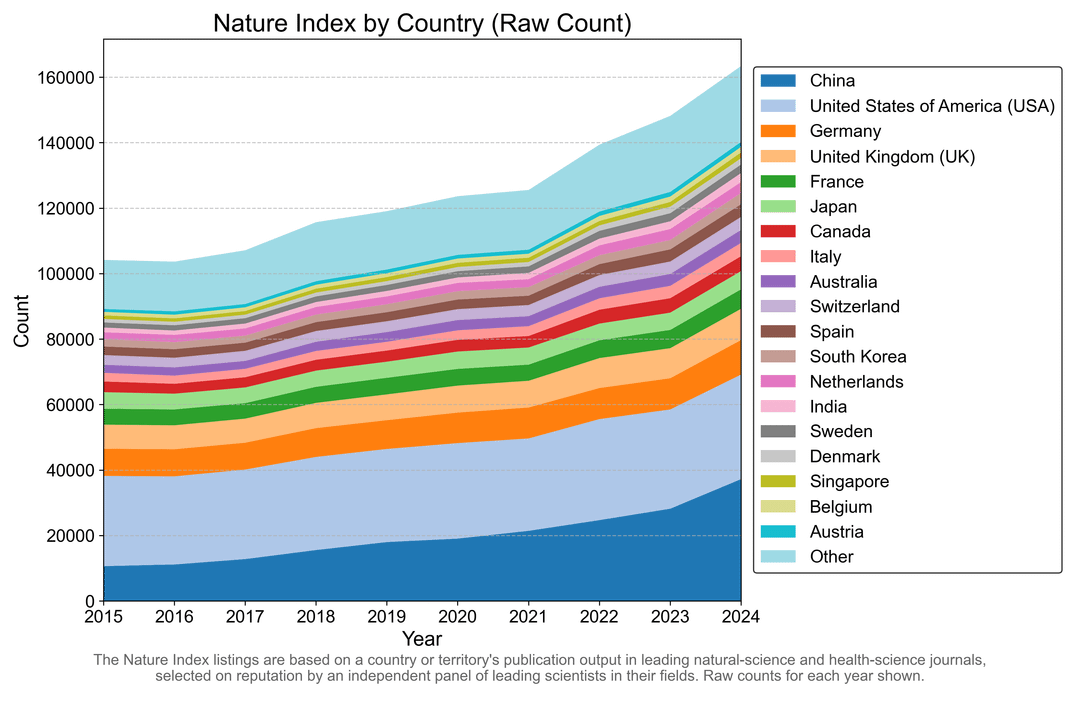 Data obtained from [Springer Nature](https://www.nature.com/nature-index/research-leaders/2025/country/all/global). Graphs generated using Python Matplotlib.