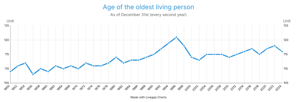 Graph made with Livegap charts (https://charts.livegap.com/), using this source material: https://en.wikipedia.org/wiki/Oldest\_people#Chronological\_list\_of\_the\_oldest\_known\_living\_person\_since\_1951